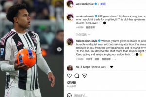 体育资讯12月3日讯 在尤文2-0击败乌迪内斯后,完成尤文生涯第200场里程碑的麦肯尼更新了社交媒体。