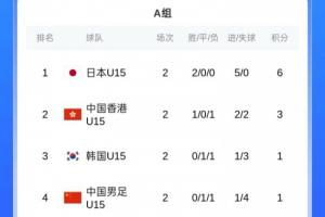 A组积分榜,日本U15两连胜进5球0失球小组第一,中国香港U15两场1胜1负第二,韩国U15两场1负1平第三,国少两场1负1平进1球丢4球继续垫底。