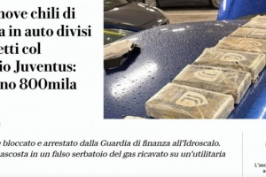 在随后的搜查中,调查人员在车辆备胎位置改装的一个假储气罐内发现了9公斤可卡因。引人注目的是,这些被压制成砖块状的毒品上均印有尤文图斯的标志。